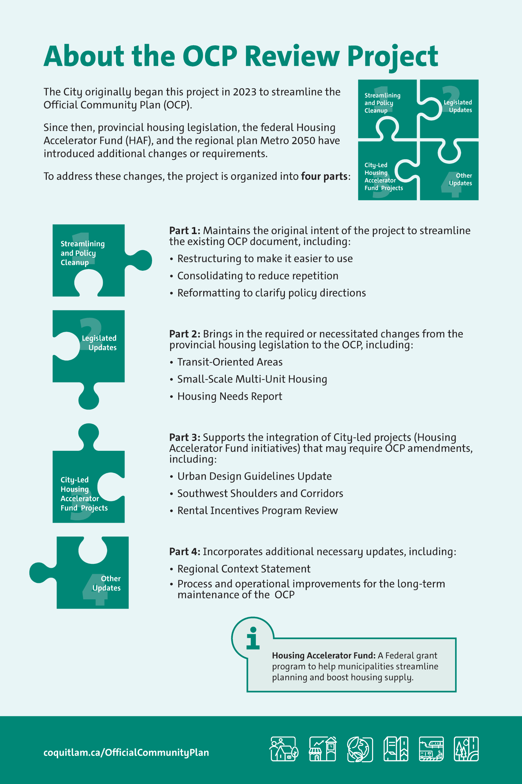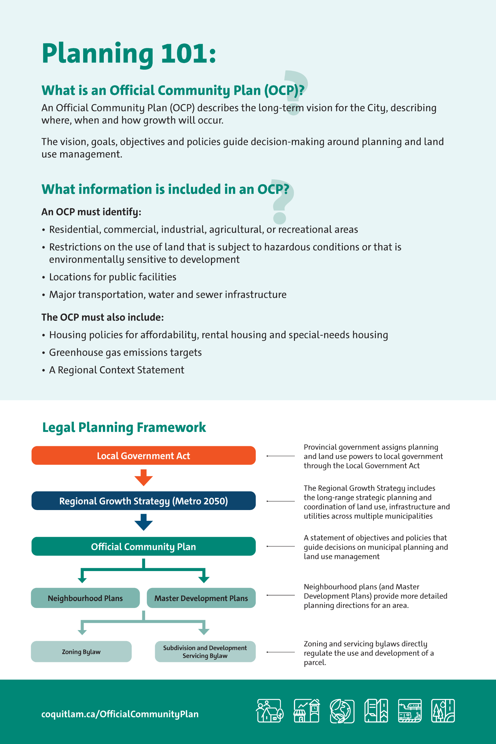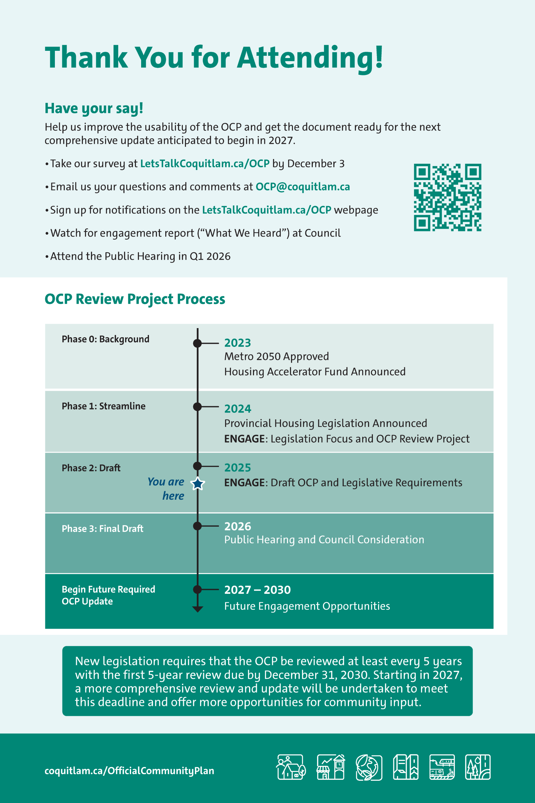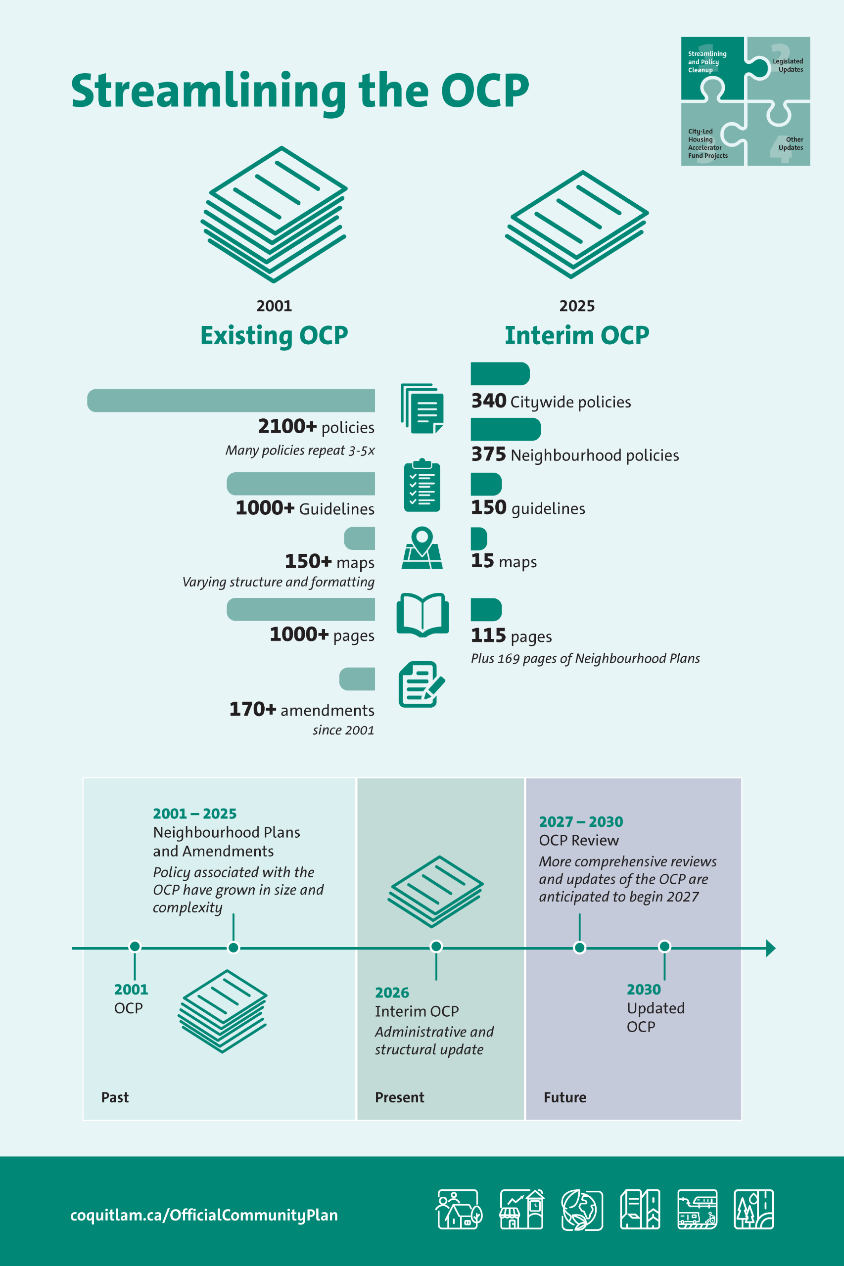 The City of Coquitlam is streamlining its Official Community Plan (OCP) to make it easier to understand, easier to use and better aligned with new Provincial Housing Changes. Under new provincial legislation, the City is now required to review the OCP every five years. Coquitlam’s next review is anticipated to begin in 2027, with completion targeted for 2030.