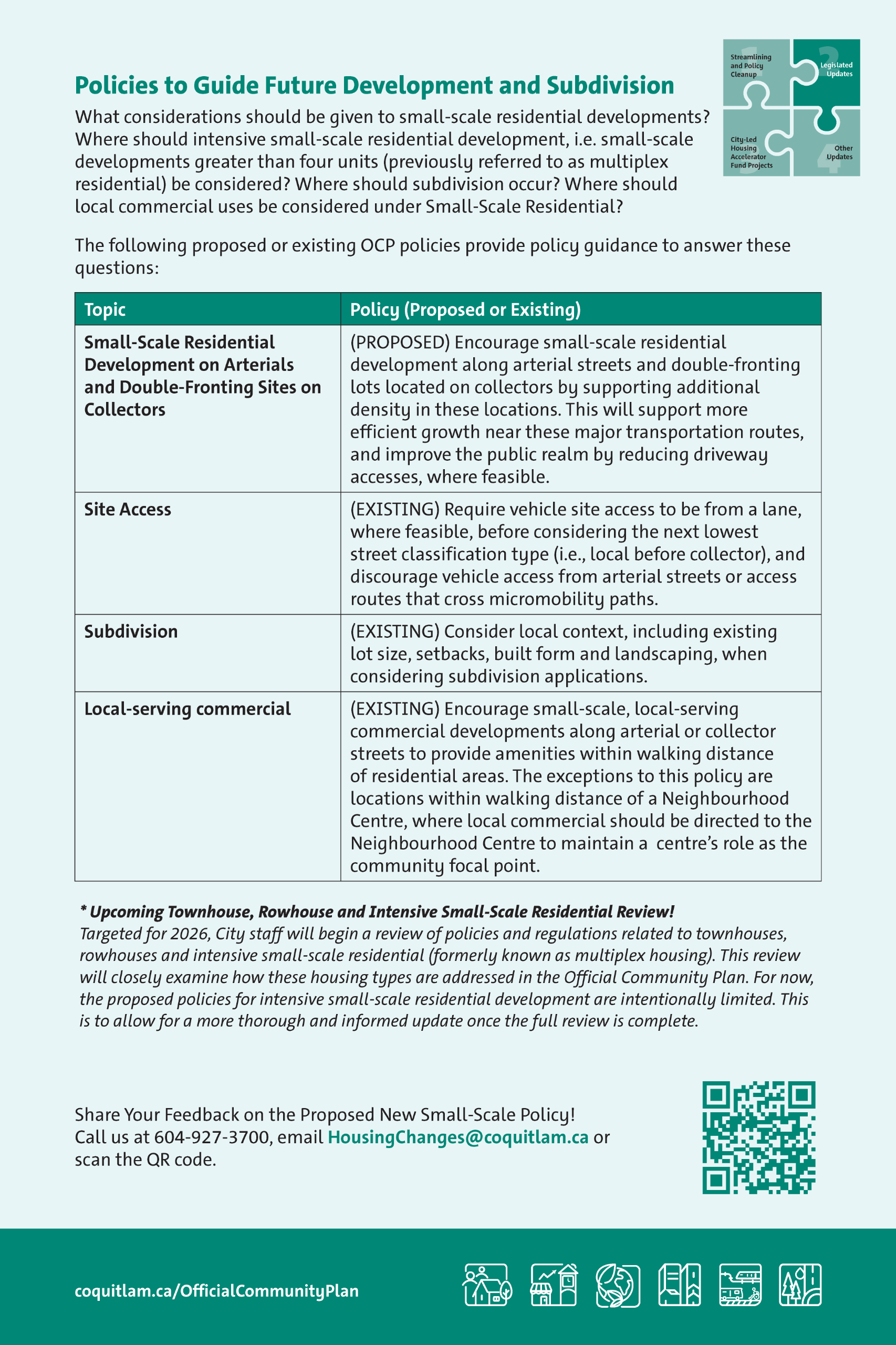 The policy updates required to support the provincial legislative changes will be provided from other project teams that are undertaking the Provincial Housing Changes work and are being incorporated into the streamlined OCP. No new policy, except what was necessary to align with legislation, will be introduced through the OCP Review Project.