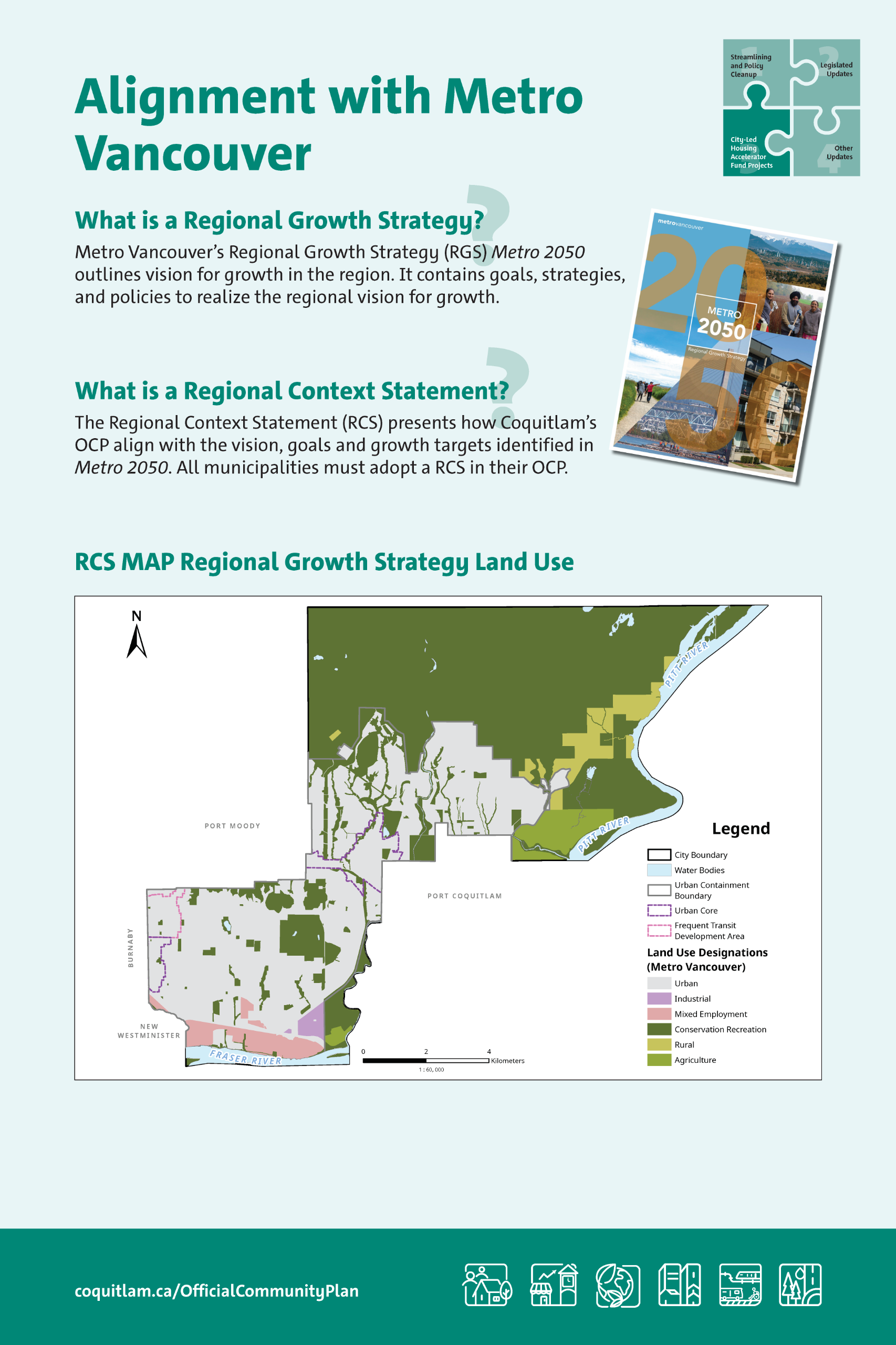 Metro Vancouver updated its regional growth strategy, Metro 2050, in 2023. Every municipality must have a Regional Context Statement – a section in the OCP that shows how the City’s plans line up with the regional vision for growth, housing, jobs and transportation. Updating the OCP’s Regional Context Statement is included in this project.