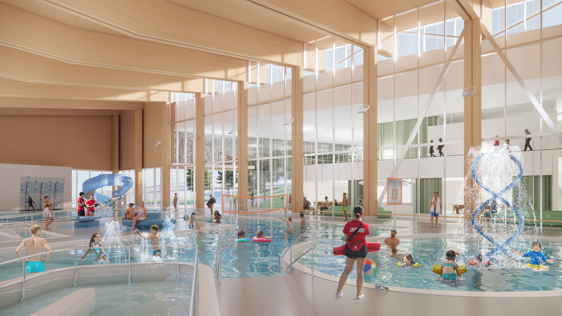 - A six-lane lap pool, leisure pool with lazy river, hot pool, steam room, sauna, climbing wall and drop slide
